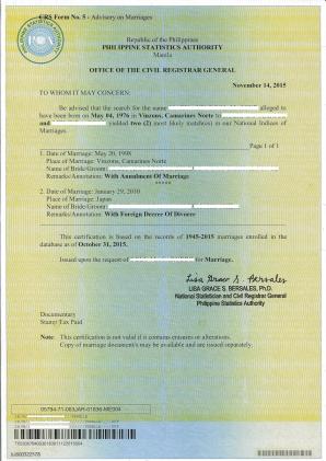 離婚裁判が終了した婚姻記録証明書・Advisory on Marriages